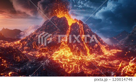 Volcanic eruption displays glowing lava flows on mountains at dawn