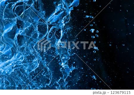 青の背景に飛び散る水飛沫.