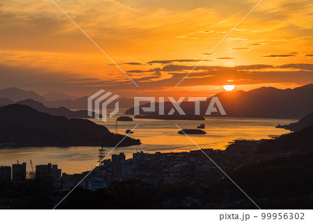 日本 広島県尾道市の千光寺頂上展望台から見える瀬戸内海と夕焼け空