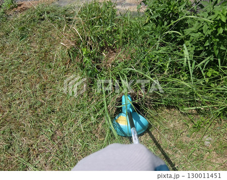 草刈り機で庭の手入れをする