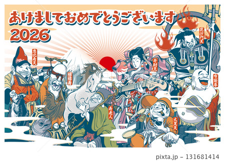 2026年賀状テンプレート「ちょっとおかしな七福神」あけおめ 手書き用スペース付パターン