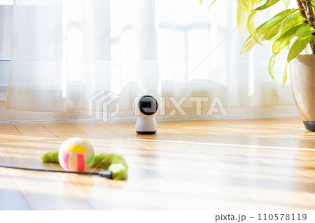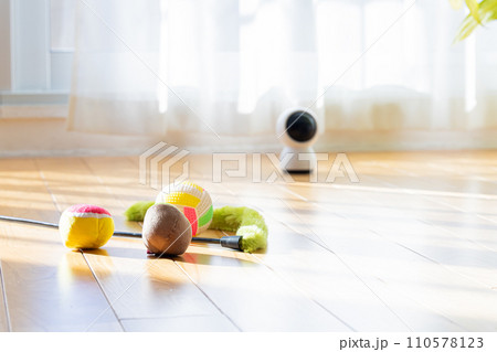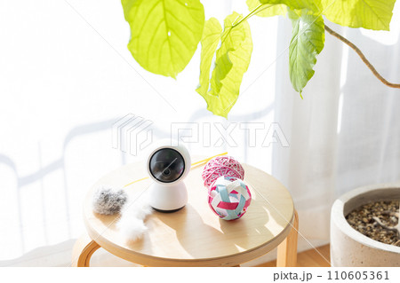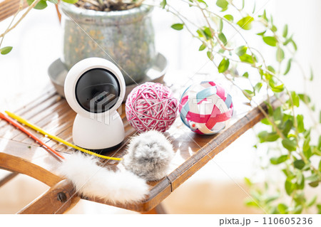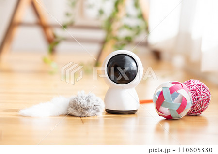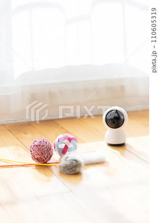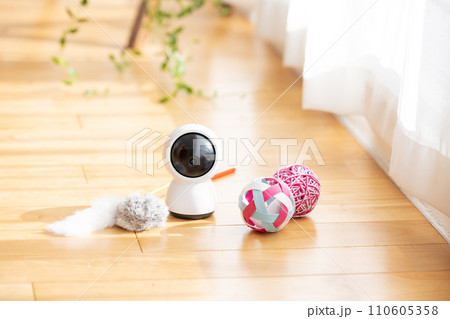 リビングの床に置かれたペットカメラと猫のおもちゃ