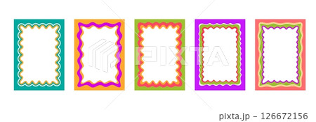 Rectangular colored retro frames with squiggly, zigzag wavy edges. Vector cute borders for photos, labels, stamps isolated on white background