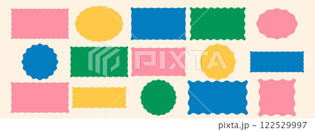 Set of colorful oval, rectangle, square and circle shapes with wavy edges. Simple geometric forms with scalloped borders. Empty text boxes, tags or labels templates. Vector graphic illustration