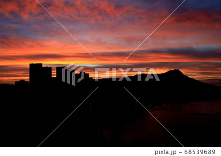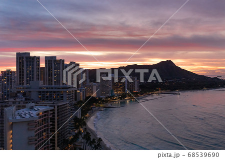 ハワイのワイキキビーチとダイヤモンドヘッド シェラトンホテル30階からの朝焼け