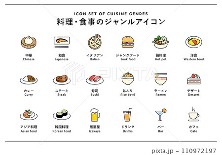 料理・食事のジャンルのアイコンセット カテゴリー 種類 グルメ 和食 洋食 和洋中 イタリアン 外食