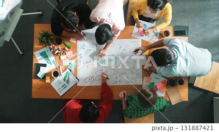 Business people writing at notes and making mind map at meeting. Convocation.