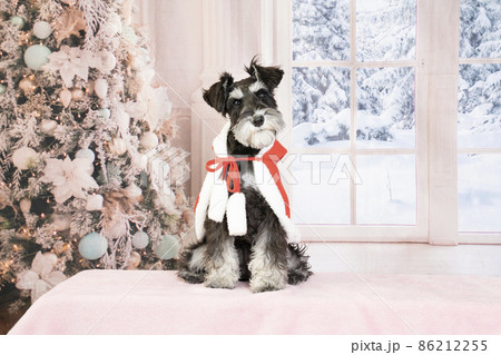 クリスマスの背景とサンタの衣装を着たミニチュアシュナウザー