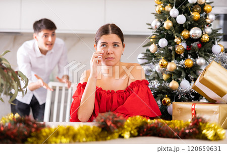 Annoyed young male and female getting mad at each other while standing near of Christmas tree in apartment