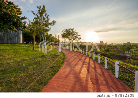 Taichung City, Taiwan - November 28, 2022 : Sunset time in Taichung Central Park. Xitun District Shuinan Economic and Trade Area.