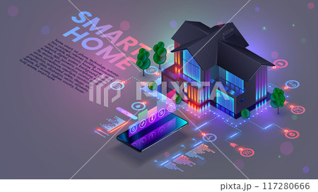 Smart home isometric conceptual background. IOT or internet of things house system. Smart home connection and control with devices through home network. Phone control domestics devices in smart home.